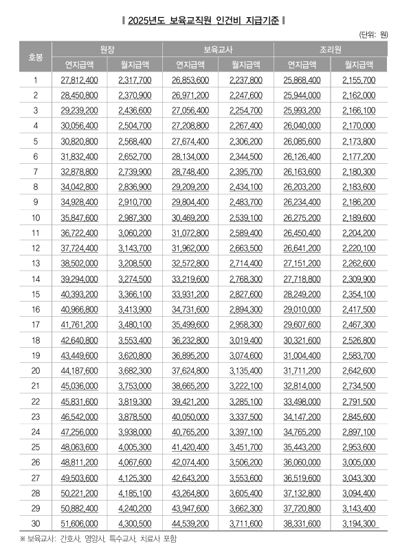 2025년 보육교사 급여는 전년 대비 약 3% 인상되었으며, 정부의 공식 호봉표에 따라 지급됩니다. 신입 교사부터 30년차 경력 교사까지의 월급 정보를 아래에서 확인해보세요.