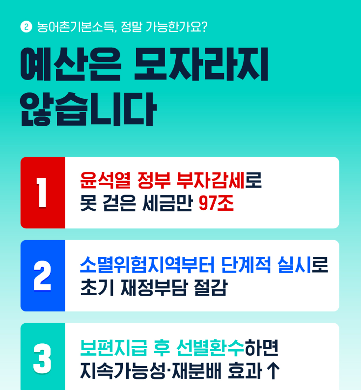 최근 몇 년간 농촌 지역의 인구감소율은 –6%, 고령화율은 38%를 넘습니다. 이런 상황에서 기본소득은 단순한 복지가 아니라 ‘지역을 지키는 경제정책’입니다. 도시보다 기회가 적은 농어촌에 기본소득이 지급되면 소비가 늘고, 상점과 시장이 살아나며, 지역 일자리도 늘어나는 선순환이 기대됩니다.